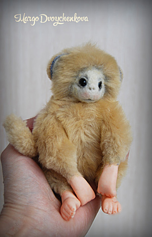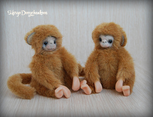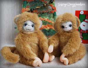 Обезьянки выполнены из немецкого искусственного меха, миништофа, набивка синтепух и шерсть для валяния, утяжелены металлическим гранулятом, 10 шплинтов, глазки стекло, ступни и кисти ручек из запекаемой пластики. Тонировка сухой пастелью.