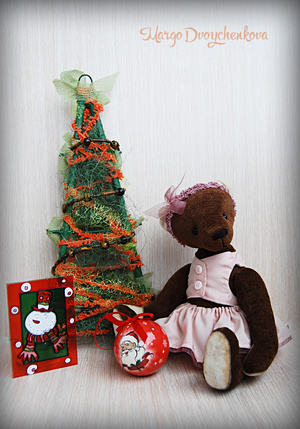 Злата одета в сарафанчик из мелкого вельвета шоколадного цвета, застёжки на деревянных пуговичках. Сарафан снимается. На "золотой" головушке у мишки капроновая жатая ленточка.