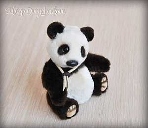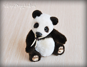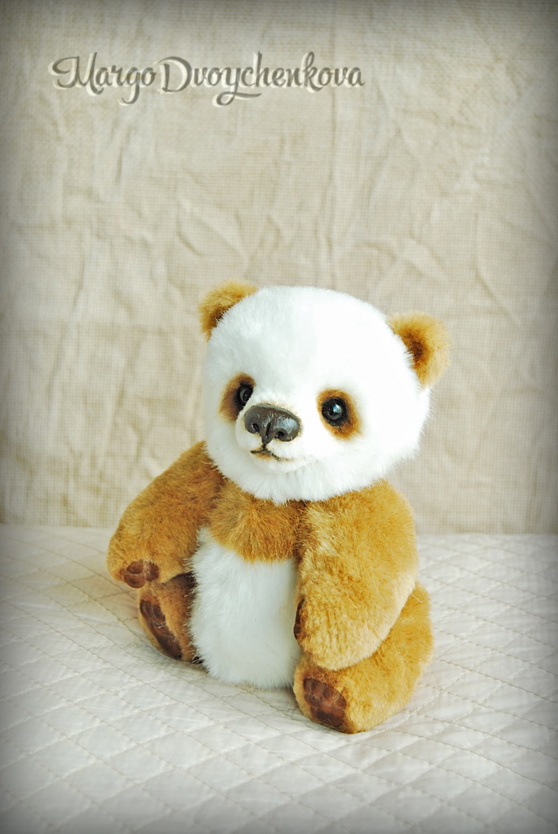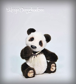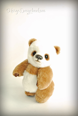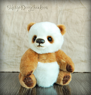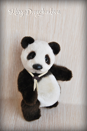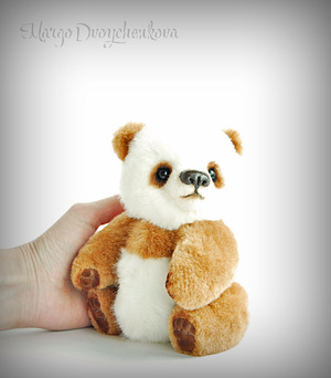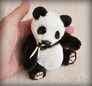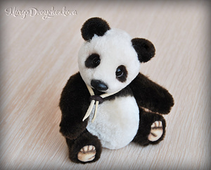 Панда выполнена полностью вручную по авторской выкройке из немецкого искусственного меха Schulte, искусственной замши, набивка синтепух, утяжелена металлическим гранулятом, 6 шплинтов, глазки стекло, носик вылеплен вручную, тонировка художественным маслом и маркерами.