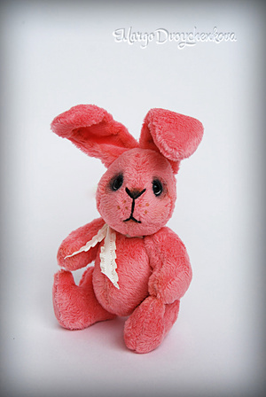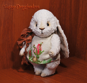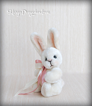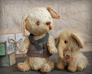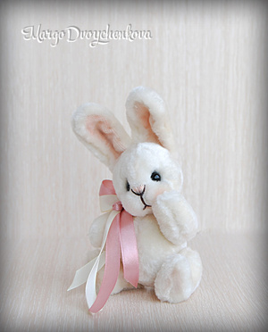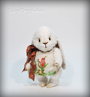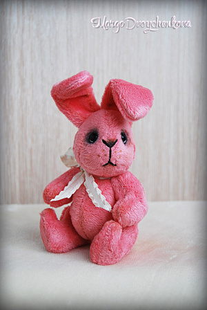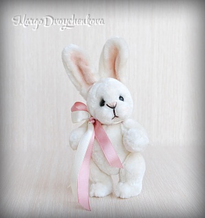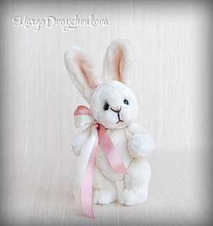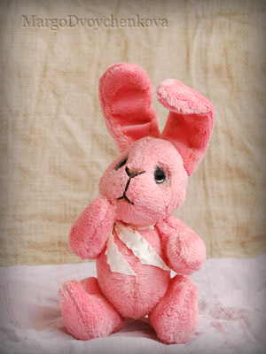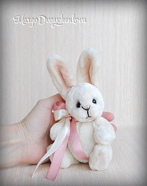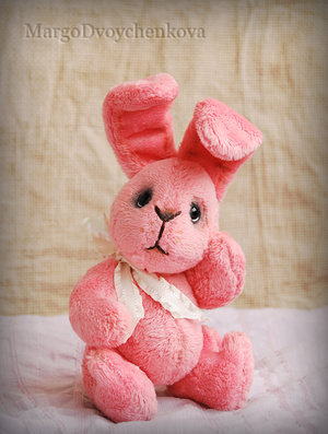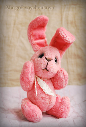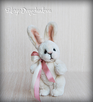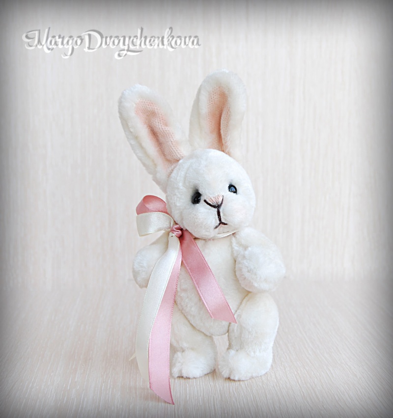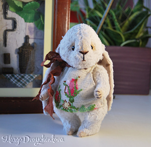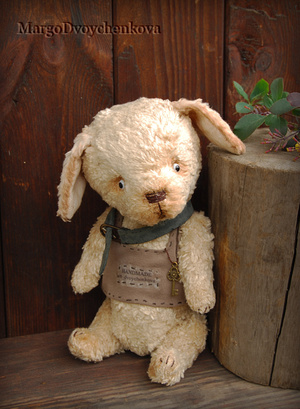 Зайка Мила выполнена полностью вручную из немецкой вискозы, внутреннее ушко из американского хлопка, набивка синтепух, утяжелена металлическим гранулятом, 6 шплинтов, глазки стекло, затонирована художественным маслом.