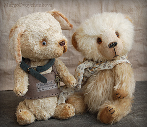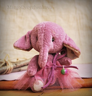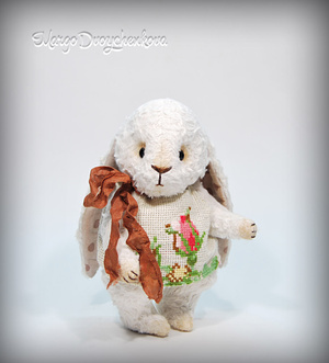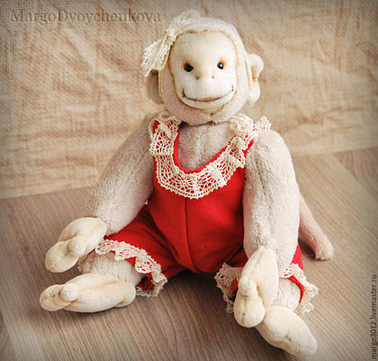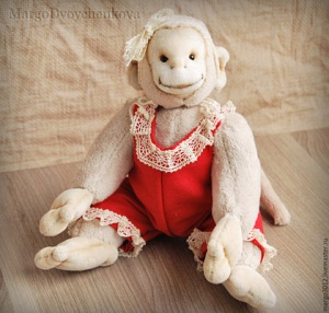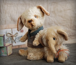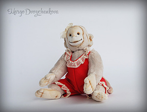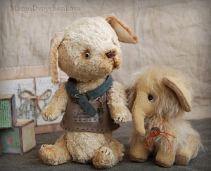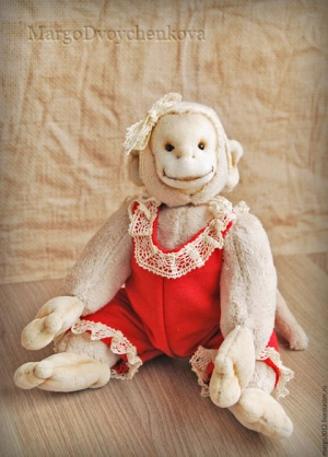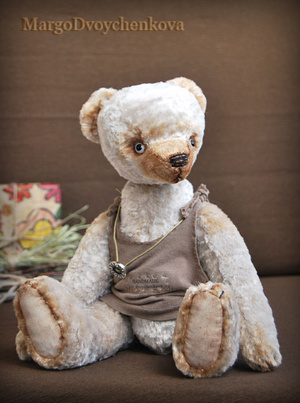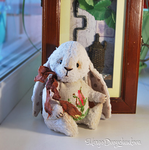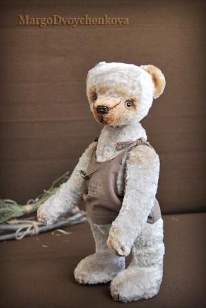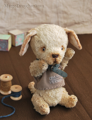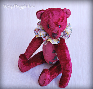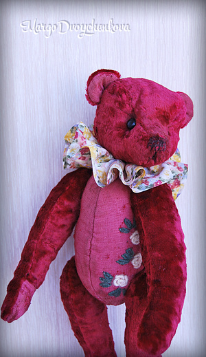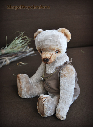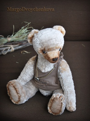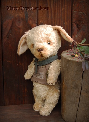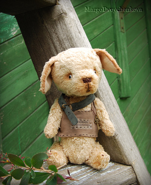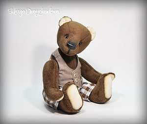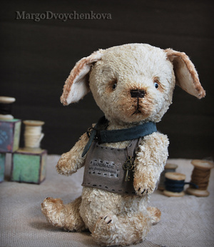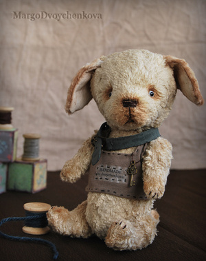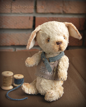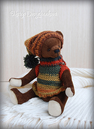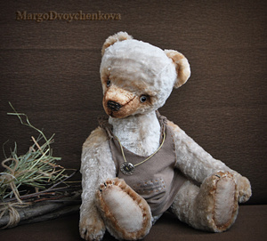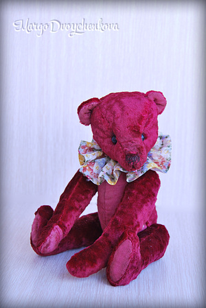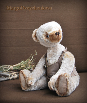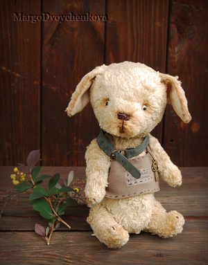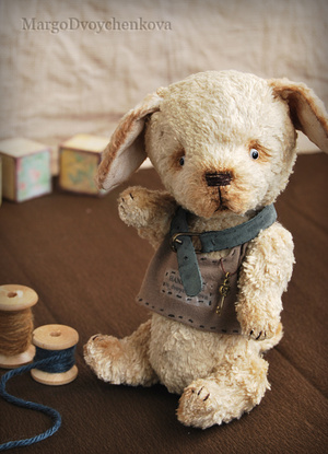 Выполнен полностью вручную по авторской выкройке из двух видов немецкой вискозы, набивка синтепух, утяжелён минеральным гранулятом, 6 шплинтов, глазки стекло, затонирован и слегка состарен художественным маслом.