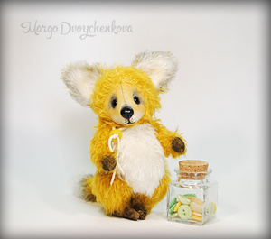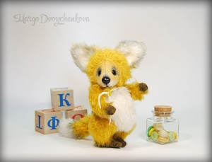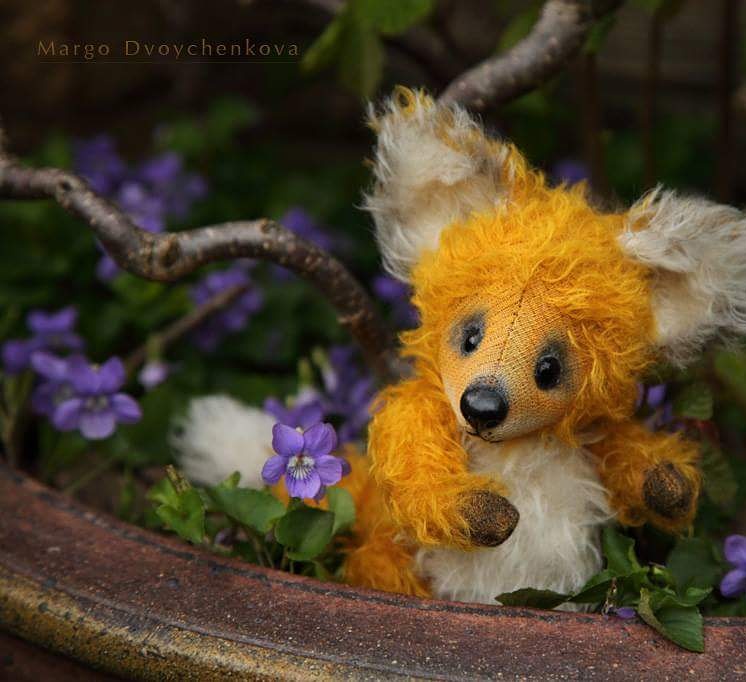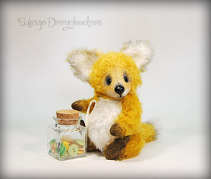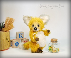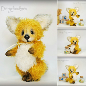 Лисёнок Макс выполнен полностью вручную по авторской выкройке из двух видов немецкого мохера, набивка синтепух, утяжелён минеральным гранулятом, 6 шплинтов, глазки стекло, ушки и хвост армированы, тонировка художественным маслом.