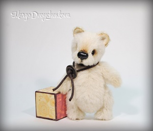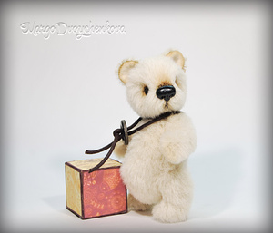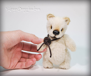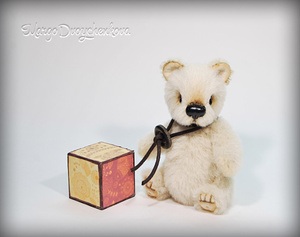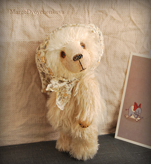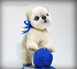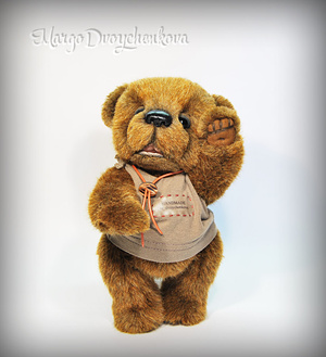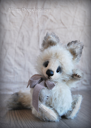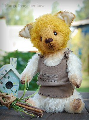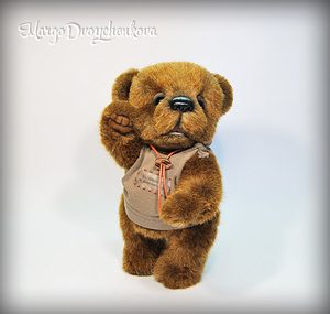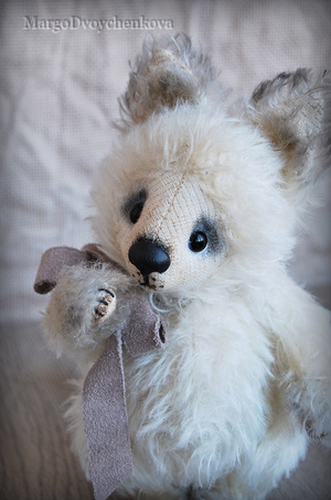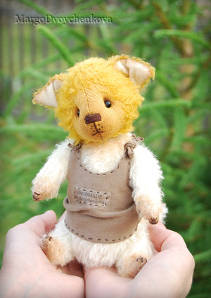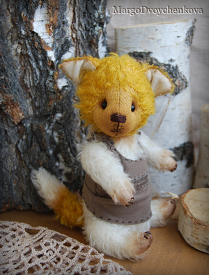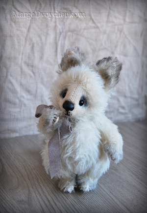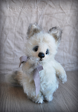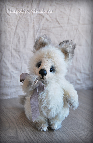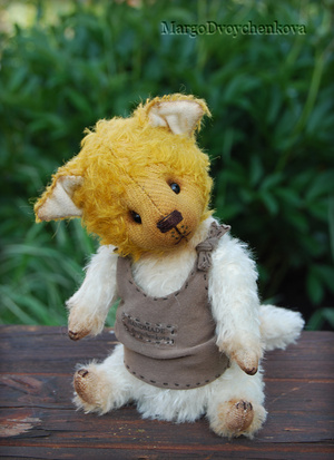 Выполнена полностью вручную по авторской выкройке из немецкого мохера Schulte, набивка синтепух, утяжелена металлическим гранулятом, глазки стекло, 6 шплинтов, носик ручной лепки, верхние лапки и хвостик армированы, тонировка художественным маслом.