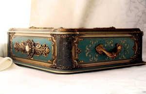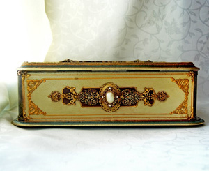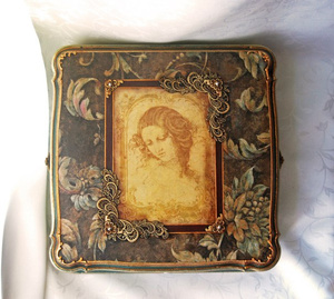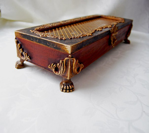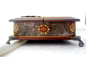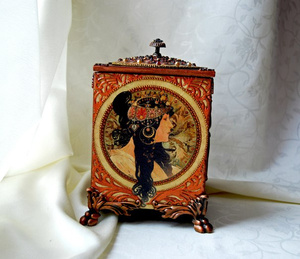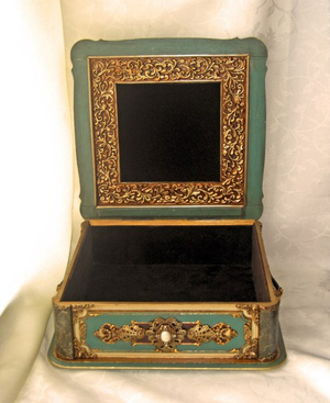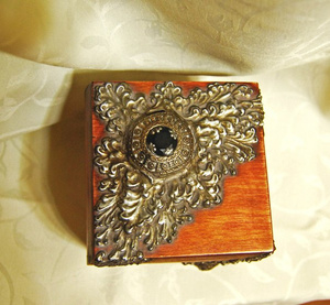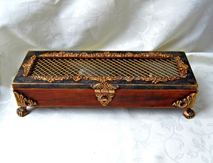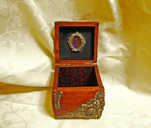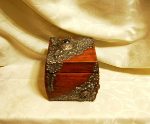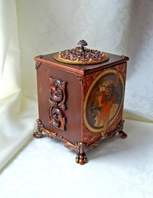 Шкатулка выполнена из натурального дерева подвергшегося многослойному морению и объёмной росписи имитирующей металл. Внутри дно и крышка обтянута бархатом, стенки декорированы в технике декупаж