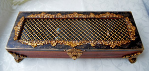 Настольный секретер для хранения важных аксессуаров. Благородная вещь в солидном исполнении. Ящерица и медальоны из янтаря. Морение дерева с имитацией резьбы, отделка бархатом. Золочение и патина.