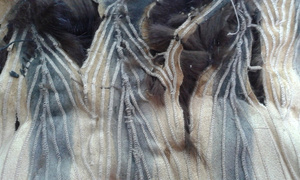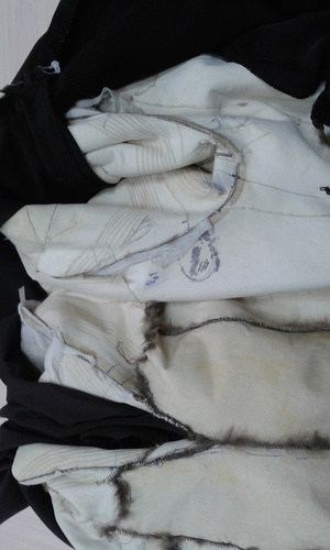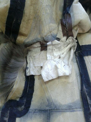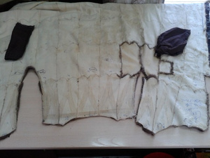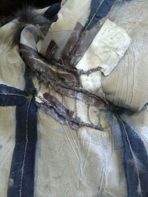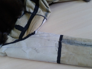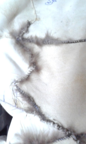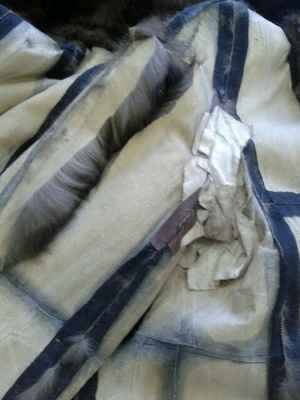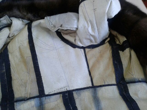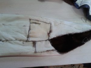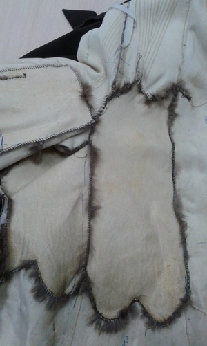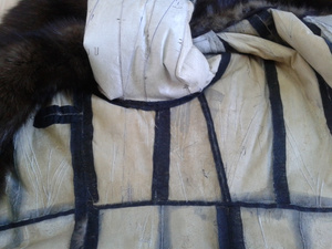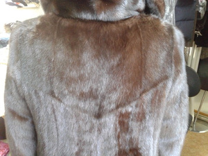 ,видимо еще поддав пару,или сушат влажные шубы.Не признаются,осознав свою ошибку.Но -вот результат.Свареная и разрушенная напрочь кожевая ткань.Шуба была "в роспуск",но,делать нечего,пришлось делать кокетку из подобранного меха,на фото видно стыки,но вживую все практически сливается.