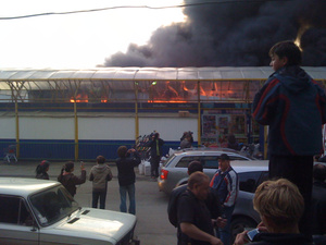 и еще.. На переднем плане видно, как тогровцы товар спасают из киосков, боясь, что на них перекинется огонь.а я уже видел фотки, как сами работники грузят уцелевший товар в машины и спешно увозят в неизвестном направлении