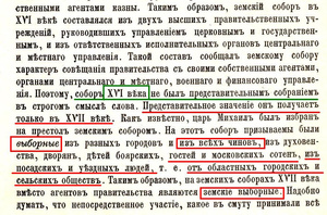 "В 16 веке Земские соборы не были выборными. “Выбор как специальное полномочие на отдельный случай тогда не признавался необходимым условием представительства, - писал Ключевский. - Столичный дворянин из переяславских или юрьевских помещиков являлся на собор представителем переяславских или юрьевских дворян". Дальше будем играться или поговорим нормально?