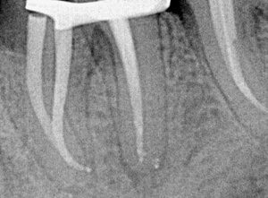 Сколько времени потратили в первое посещение на работу с шестым зубом не столь важно. Доктор, может быть, основную часть работы оставил на повторный визит. Главное, что бы после пломбирования корневых каналов он выглядел на снимке примерно так.