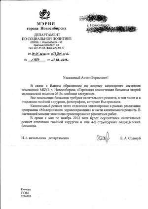 Направили бы еще обращение в Министерство здравоохранения НСО с фотоотчетом и копию В.В. Путину в блог. Вот тогда может и был отзыв.