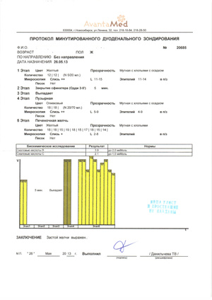 Через 4 месяца после травления (через 2 после окончания желчегонной терапии после травления) – без особенностей и желчь прозрачная.