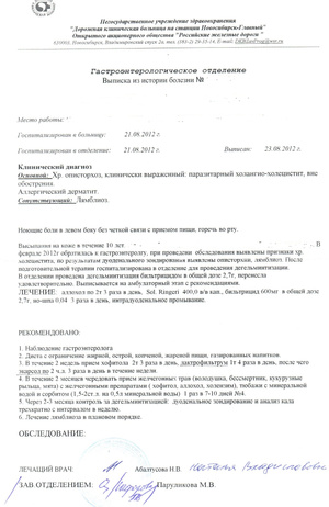 Поэтому подготовительный период (как и последующий после приема Бильтрицида) был направлен в максимальной степени на улучшение оттока желчи. Хотя бы временное улучшение, достаточное для последующей оперативной эвакуации паразитов.