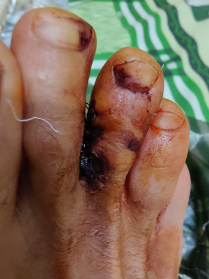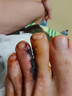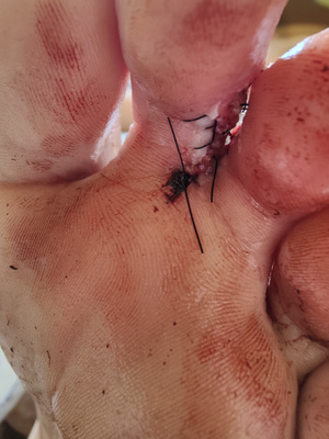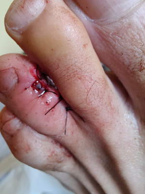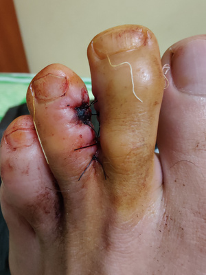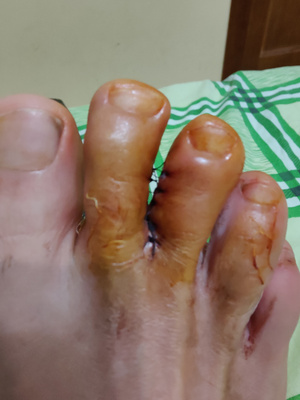 Швы сняли где то через неделю, ничем мазать и поливать не назначили, только прокладки между пальцев...