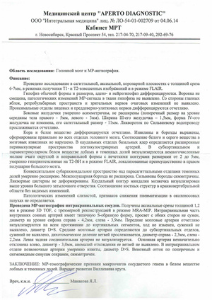Добрый день, в течении длительного времени мучают головные боли, в основном в области висков, сопровождаются тошнотой, иногда бывает рвота. Сделала МРТ, с результатом анализа пошла к неврологу по месту жительства, врач сказал, что я здорова. Не могли бы вы посмотреть результат МРТ (скан МРТ прикрепляю) и порекомендовать врача. Т.к. боли не проходят. С возрастом стало переносить их тяжелее. Заранее спасибо.