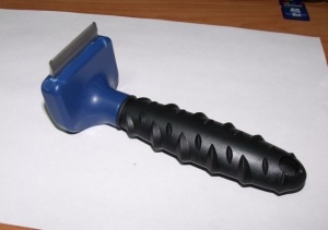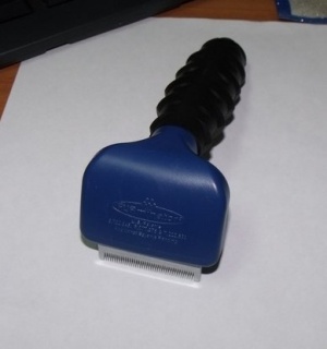 попробовал, вычесывает действительно хорошо, кстати, нож очень сильно напоминает нож от машинки для стрижки волос, вот думаю можно в парикмахерской какой нить взять старый тупой нож, прикрутить его к рукоятке и им скрести, будет не хуже. Так что если у кого есть знакомые парикмахеры, спросите про такие ножи. Если надо сфотаю нож подпробно и выложу фотки тут..
