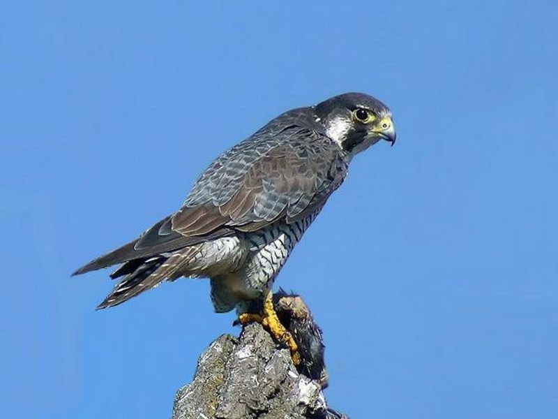 А потом еще взлететь то не могут. Руками машут, а не получается.У глухарей рук нет - крылья у них. Но вот видел в лесу сокола-сапсана. ОН спокойно сидел на ветке и глядел на меня своими большими глазами. Затем обеспокоился и взмыл в небо. И тут я увидел настоящий воздушный бой. Несколько ворон летели с помойки (а клювищи у них здоровенные), сокол поднялся выше них, вороны особо не беспокоились, судя по поведени. (их было больше, и атакуют они стаей), оказалось зря так беспечно отнеслись. Сокол атаковал на чудовищной скорости сверху. Он ударил одну ворону когтями, но не успел зацепить, она полетела кувыркаясь вниз и рухнула в лесок. Остальные консолидировались, сбившись в плотный косяк, готовый наказать наглеца. Но, сапсан молнией ударил в хвост косяка, подхватил ворону улетел под громкие их вопли. Жаль, что не заснял. В интернете выискал фото этого могучего симпатяги. Очень похож на того, что я видел. Этот вид соколов не встречался мне лет 10-ть, а сейчас опять появился.