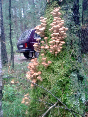 по дороге на Плотниково, на трассе все завалено опятами, продают на каждом углу!