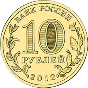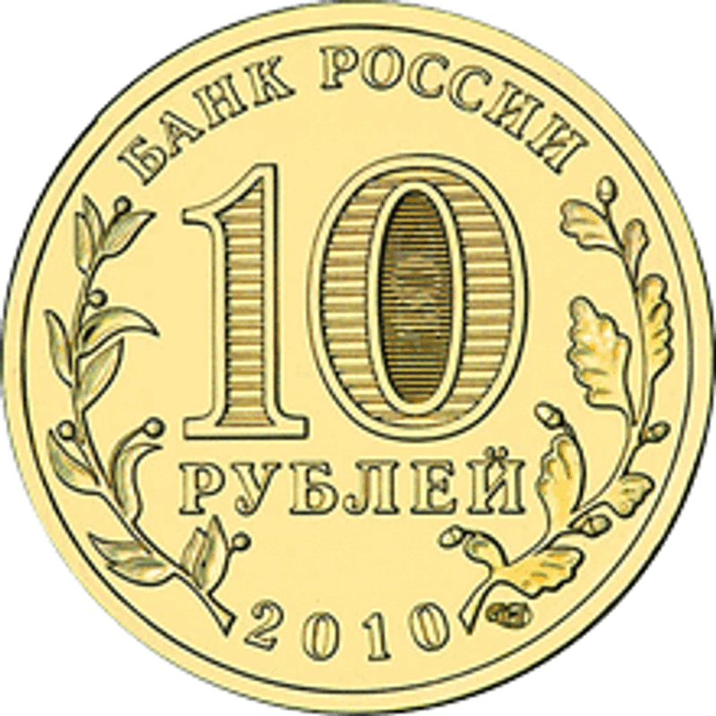 На лицевой стороне монеты по окружности расположены надписи: в верхней части - "БАНК РОССИИ", в нижней части - "2010". Слева и справа расположены изображения ветви лавра и дуба, соответственно. В центре расположены число "10" и надпись "РУБЛЕЙ" под ним, обозначающие номинал монеты. Внутри цифры "0" имеется защитный элемент в виде числа "10" и надписи "РУБ", наблюдаемых под разными углами зрения к плоскости монеты. В нижней части расположен товарный знак монетного двора.