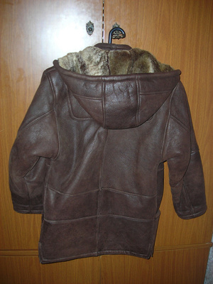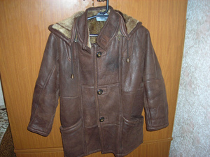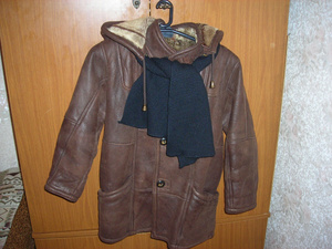 Дубленка на мальчика 5-8 лет (в зависимости от комплекции ребенка) натуральная кожа и мех б/у, состояние хорошее. Есть небольшое пятно, его видно на фото. Можно носить шарф наверх и его будет не видно. Капюшон отстегивается, по бокам маленькие разрезы, рукава можно подвернуть. Производство Италия. Длинна по спине от капюшона 64см., длинна рукава от плеча 49см., длинна плеча 13см.