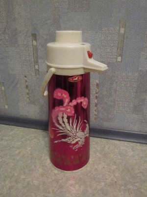 7) термос на 1 чашку, со стеклянной колбой, снаружи пластмасса слегка пожелтела и полиняла от времени.