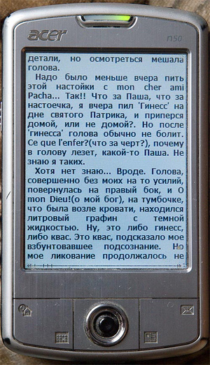 В комплекте: зарядное + USB-шнур для компа + запасной аккумулятор + запасной стилус + дорожное питание на 4 пальчика (удобно, комплекта "пальчиков" хватало где-то на дополнительные 14-16 часов чтения) + могу подбросить карту памяти CF (для книжек - самый раз). Можно читать, можно шататься в сети, если мини-эксплорер устраивает, можно играть (шахматы, pocketUFO и т.п.). Из "особенностей": не работает SD-слот (CF-слот работает), не работает рычаг блокировки кнопки питания (т.е. защита от случайного включения).
