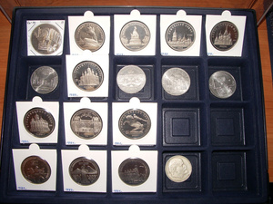 5 рублёвые: 70 лет Советской власти,Памятник «Регистан»,Успенский собор,Государственный банк СССР,Матенадаран,Памятник «Тысячелетие России», Благовещенский собор,Архангельский Собор,Памятник Петру Первому,Большой дворец,Софийский Собор,Памятник Давиду Сасунскому,Собор Покрова на рву. 3 рублёвые:70 лет Советской власти,50 лет победы в сражении под Москвой,Годовщина землетрясения в Армении.