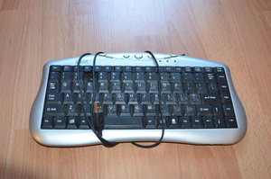 USB клавиатуру без русских букв с отсутствующей клавишей "3". Грязная, но рабочая, правда клавиша потерялась...