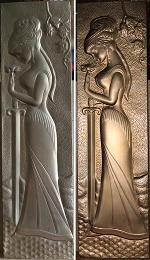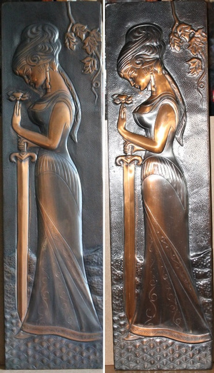 1) Две женщины и птица, размер по большим сторонам 28х14 см.