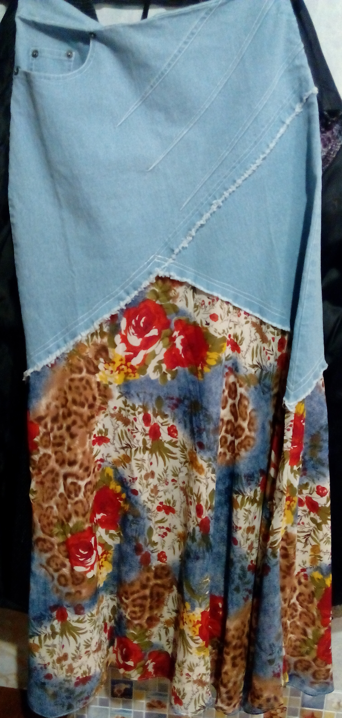 3) юбка комбинированная, новая. Низ двойной из лёгкой ткани, верх под джинсу, на рост не ниже 170, р-р 48-50. Обмен на 3 шоколадных батончика (Твикс или Баунти большие).