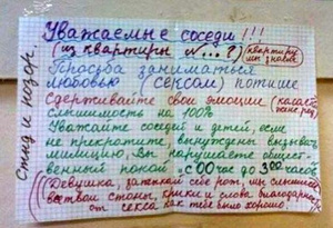 а вы ей на дверь записку прилепите с просьбой так не орать и с подписью всех соседей! может стыдно станетНе поверите, писали)) правда без подписей. Их дверь рядом с нашей, я даже пыталась подловить их, но они видимо очень поздно приходят и очень тихо выходят