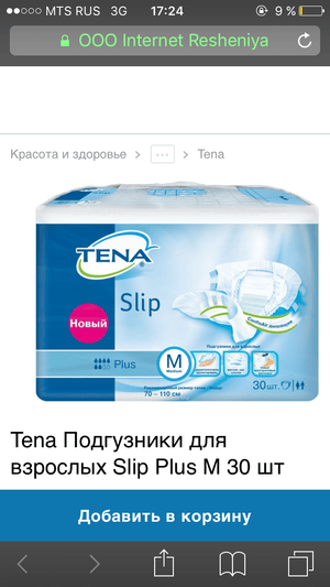 Памперсы для взрослых seni 30 штук и tena slip 30 штук размер М по 500 рублей 14 пачек вместе.