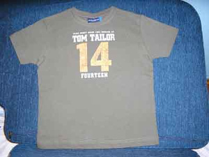 Майка болотного цвета, с надписью впереди. Ширина 37см, по спинке 45см (на этикетке рост 110). Фирма «Tom Tailor». 300 рублей.