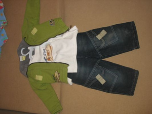 Продам костюмчик: куртка "пилосткая" с аппликацией самолетиком, толстовочка с таким же принтом и джинсы утепленные. На холодное лето-теплую осень. Ношен мало, толстовку не надевали вообще ни разу. Очень симпатично смотрится. Размер написано 24м, но реально на рост от 80 до 86см. 500.