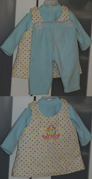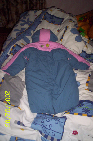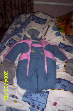 2) Теплый костюмчик на 6 месяцев (Турция). Штаны+толстовка из флиса+сверху надевается сарафанчик из хлопка, утепленный. 500 рублей. Куплен в Нати за 1290 весной, стиран 2 раза, одет раза 3, потом выросли.