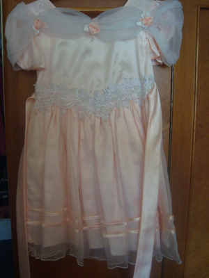 Нарядное платье (на ярлыке написан рост 70 см) . Нежного персикового цвета. Продам за 250 рублей.