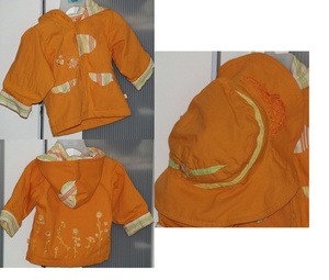 1) Оранжевая курточка с подкладом (не теплая) + панамка, оранжевый цвет преобладает, вышивка на спине, на 5-6 месяцев. 300 рублей. Пр-во Польша. Покупался 2 мес назад за 700.