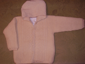 Продам жакет с капюшоном, цвет беж, шерсть, ручная вязка, на подкладе (синтепон), на возраст 2-4 года, длина по спинке 42 см, цена 850 руб.