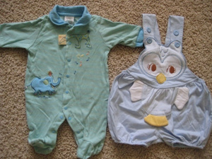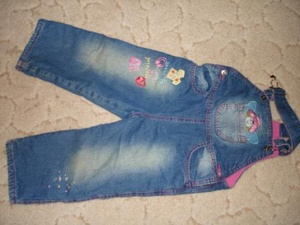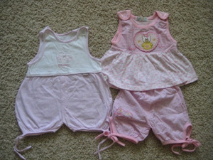 Есть 3 новых нарядных костюмчика: маечка и комбенизон-шортики. Розовый, желтый и зеленый. Примерно на 6 месяцев. Фото, к сожалению, не могу выложить, сейчас фотоаппарата пока нет.