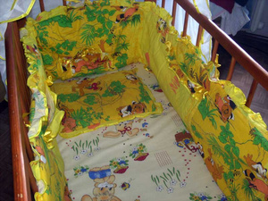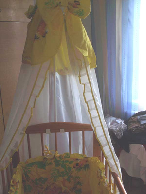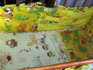 Набор в кроватку - борта с двумя кармашками, подушка, простынь, и большой шикарный балдахин + держатель в подарок + еще две сменные простынки желтенькую и зелененькую... Шили на заказ дорого, состояние отличное. отдам все добро за 1100 р.