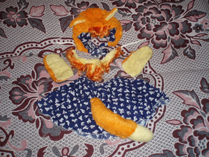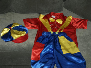 Костюм клоуна ( р-р 28/110): рубашка с короткими рукавами, бриджи на лямках, кепка а-ля "Олег Попов" и бабочка. Отдам за 400 руб. Одевали один раз.