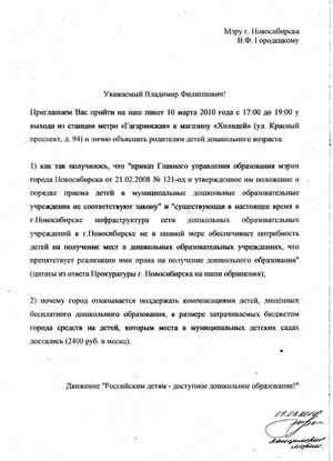 Приглашаем Вас прийти на наш пикет 10 марта 2010 года с 17:00 до 19:00 у выхода из станции метро «Гагаринская» к магазину «Холидей» (ул. Красный проспект, д. 94) и лично объяснить родителям детей дошкольного возраста: