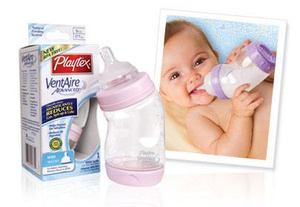 Бутылочка Playtex VentAire 0-3мес (система без пузырьков). Предотвращает проливание и в отличии от обыкновенных бутылочек предотвращает пападание воздуха в молоко при всасывании его малышом, что устроняяет газики и колики!!
