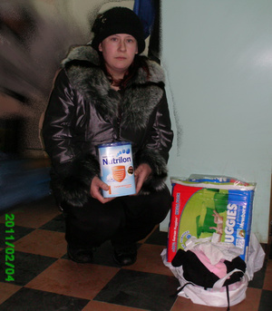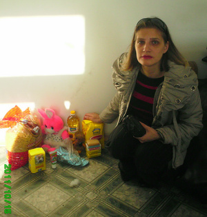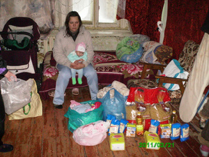 Настя - мать троих детей. Младшей Карине нет еще двух месяцев. Получила помощь в виде питания и памперсов для малышки. Также посуду и вещи для детей. Немного круп и лапши.