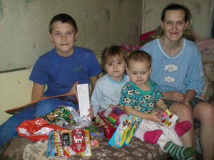 Елена приняла в дар немного вещей на Игоря 2 года, Катю 3 года и Женю 13 лет. Елена устроилась вечерней няней, дабы пристроить детей. Дети болеют. Несмотря на это Елена работает ежедневно. В ее отсутствие сидит с детьми Женя. Отец детей пьет. 2 года назад семья при пожаре потеряла дом и вс,ч то было нажито. Сейчас живут в резервном жилье.