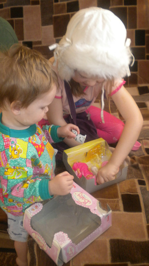 Поздравили ребятишек и передали конфеты в подарочном пакете, пупсика в наборе, набор для бисероплетения, украшения для Вероники. Ребятишки были очень рады были подаркам. Особенно, если учесть, что Ольга сейчас одна воспитывает четырех детей и подарков им не предвидится. Пришлось Машу 5 лет досрочно вывести на каникулы, т.к. на Новогодний утренник на подарок не сдали деньги.