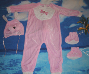 На 1годик, наверное. НОВЫЙ, длина комбинезона от плеча до низа 70см. Ткань такая мягенькая, как мех тоненький искусственный. Комбез сзади на молнии, шапочка на головку и пинетки на завязках. Цена 400р.