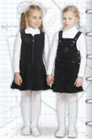 Также НОВЫЙ сарафан. Вельвет. Размер 152-40-66. Цвет - темно-синий, по грудке и по краю карманов тонкое вязаное кружево. Сарафан как на девочке справа, с пуговками. Цена 460 руб