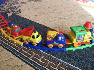 как только вы включаете его паровозик весело заводиться и под веселую песенку едет по сконструированной вами железной дороги.
