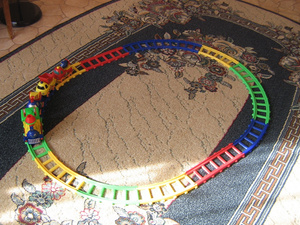Паровозик с 3 вагонами "Голубая стрела" имеет 14 разноцветных сегментов дороги. Если их собрать вместе, то длина этого пути составит 357 см.