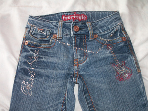 2. Джинсы FreeStyle, размер 4Т. Синие, отделаны белыми и красными стразами - выложена надпись и гитара. Изнутри пояс регулируется утяжкой. Цена 350руб